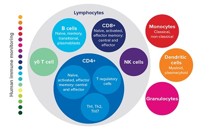 無論您想要了解癌癥治療時的免疫反應,還是尋找疾病發作的生物標志物,都需要全面檢測免疫細胞的變化。Maxpar®人體免疫監測試劑盒含29種不同金屬標簽抗體,結合Helios質譜流式儀對人體免疫細胞進行全面監測。僅利用一管樣本、單次實驗即可同時檢測人體PBMC樣本中29種不同的標志物,并根據大數據對所有主要的白細胞亞群進行綜合分析評估。