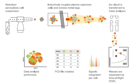 Standard BioTools質譜流式技術 (Mass Cytometry,也稱CyTOF),是一種高通量單細胞蛋白質分析技術。它利用稀有金屬標簽抗體標記細胞表面和內部的蛋白標志物,通過質譜的方式進行單細胞分析(圖 1)。由于采用穩定的金屬標簽和質譜檢測系統,質譜流式各檢測通道之間幾乎沒有重疊,背景可以忽略不計。質譜流式可以輕松實現單個細胞超過 40 種蛋白的同時檢測,系統全面地分析病理狀態下各類免疫細胞在表型和功能上的變化,從中發現一些新的免疫細胞亞群、揭示新的免疫機制,解析病原體與宿主細胞的相互作用網絡。
