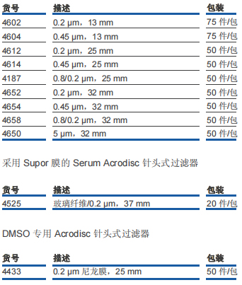 • 對于細胞冷凍保存,可使用 DMSO 專用的 Acrodisc 針頭式過濾器