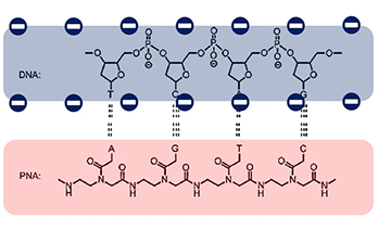 電荷中性骨架允許PNA通過Watson-Crick氫鍵與DNA或RNA結(jié)合,其結(jié)合親和力明顯高于帶負(fù)電荷的DNA寡聚體 [3]。