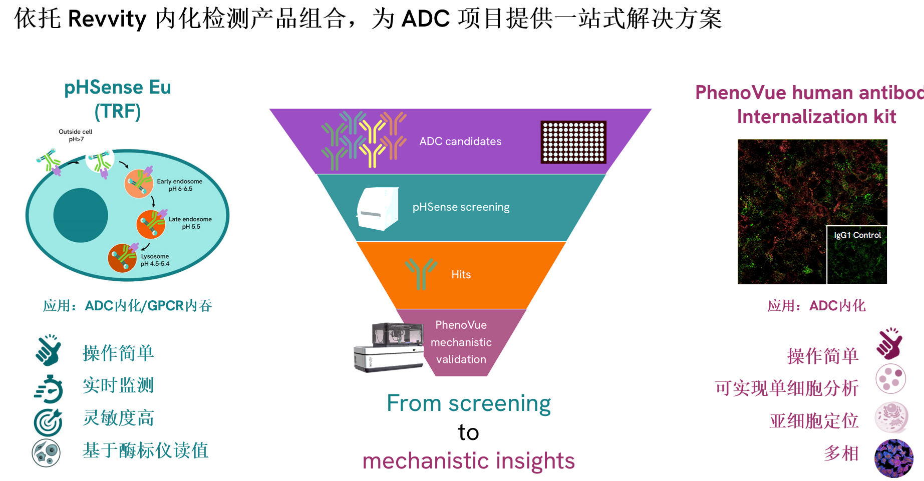 在ADC藥物研發中,內吞作用至關重要。內吞作用不僅影響藥物的釋放效率,還決定了藥物是否能夠發揮旁觀者效應,以及是否會導致劑量限制毒性。此外,內吞作用的效率和途徑與ADC的療效密切相關,因此在藥物研發早期階段需要篩選出具有最佳內吞特性的ADC分子。瑞孚迪現推出pHSense? pH敏感型Eu探針和PhenoVue抗體內化試劑盒分別用于內化能力篩選和細胞水平的機制研究。詳情>>