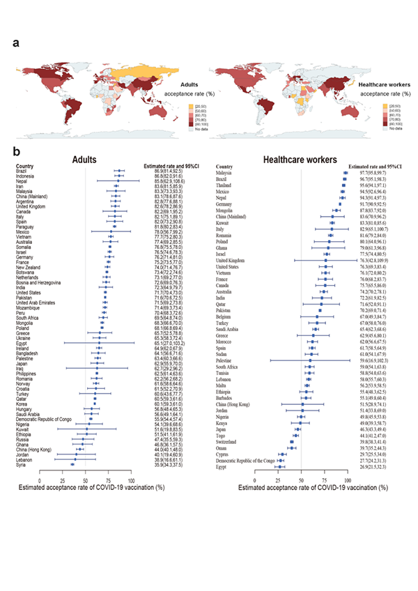 圖1. 全球成人和醫務人員新冠疫苗接受度評估(%)
