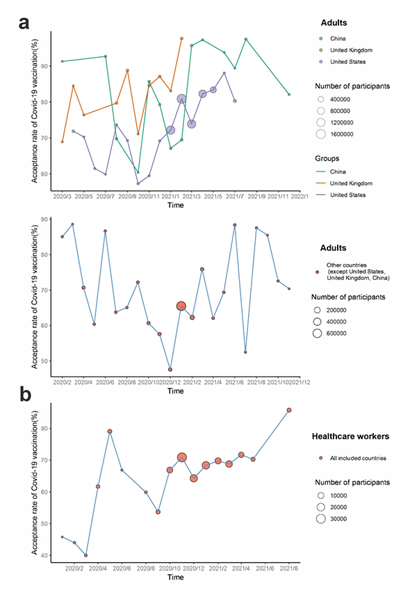 新冠肺炎(COVID-19)疫情目前已成為最具威脅性的全球健康問題,接種新冠疫苗是防控疫情最經濟有效的手段。為了達到較高的新冠疫苗接種率并實現群體免疫,需要確保公眾對新冠疫苗的信心和接受度。疫苗接受度被定義為:當有機會接種疫苗時,個人或群體做出的接受或拒絕接種的決定。目前已經有許多關于新冠疫苗接受度的研究,其在全球范圍內存在很大差異。隨著疫情的發展和新冠肺炎相關不實信息的廣泛傳播,公眾的新冠疫苗接受度可能會隨著時間的變化而變化。盡管越來越多的研究調查了公眾新冠疫苗接受度,但針對這些研究的系統綜述卻很少。通過系統綜述和meta分析,來評估全球的新冠疫苗接受度和接種率,對提高新冠疫苗接種率和防控疫情具有十分重要的意義。
