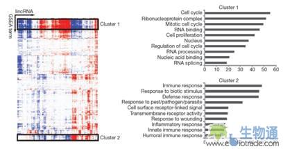 下圖是Mitchell Guttman及其同事將鑒定出的lincRNA(large intervening non-coding RNA,lncRNA的一類)與已知的蛋白編碼基因的表達數據結合,對與lincRNA表達水平顯著相關的基因集合做GSEA分析,并對GSEA結果進行雙向聚類(bicluster)后,得到了相關lincRNA所參與的特定生物學過程,為進一步探究相關lincRNA的功能提供了思路(Mitchell Guttman et al. Nature. 2008)。