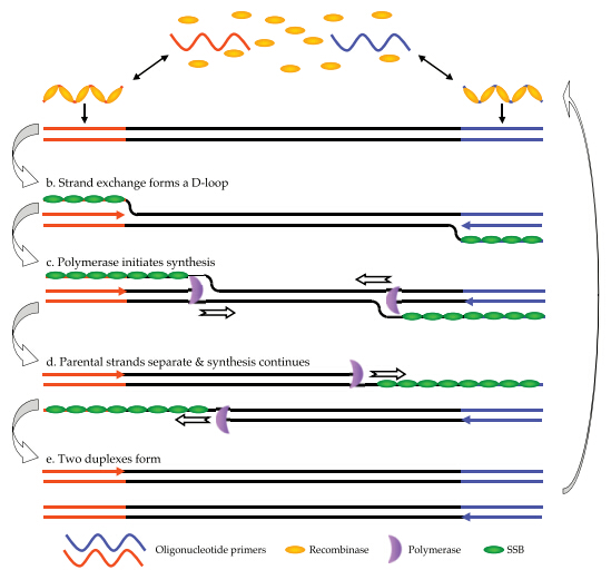重組酶與引物結合形成的蛋白-DNA復合物,能在雙鏈DNA中尋找同源序列。一旦引物定位了同源序列,就會發生鏈交換反應形成并啟動DNA合成,對模板上的目標區域進行指數式擴增。被替換的DNA鏈與SSB結合,防止進一步替換。在這個體系中,由兩個相對的引物起始一個合成事件。整個過程進行得非常快,一般可在十分鐘之內獲得可檢出水平的擴增產物。