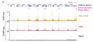 B:roX2和MSL3在X染色體靶基因中主要分布于3’端轉錄終止位點(Transcription termination site)附近。