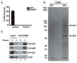 B和C)通過Xist-ChIRP獲取Xist結合蛋白電泳結果和WB。