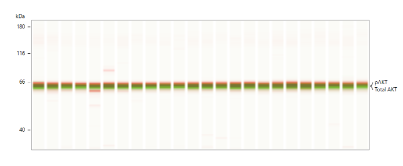 來自 Jurkat 細胞(用 calyculin A 處理)的裂解物 (0.2 mg/mL),并使用小鼠抗總 AKT 和兔抗磷酸 AKT 一抗以及 Stellar Mouse IR(綠色條帶)和 Stellar Rabbit NIR(紅色條帶)檢測模塊進行探測。Stellar NIR / IR 通道能夠在同一泳道中多重檢測總 AKT 和磷酸化 AKT,并具有出色的重現性( 24 個泳道: pAKT <10% CVs 和 Total AKT <5% CVs)。