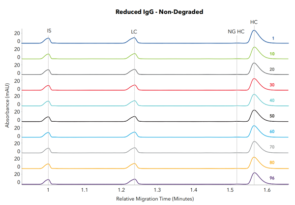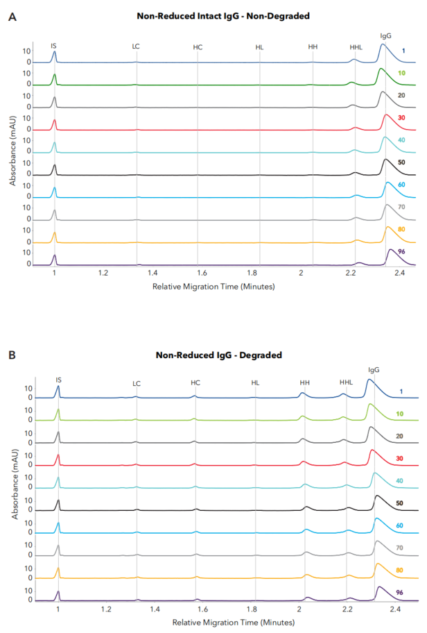 ⬆ 96個非還原型和還原型USP IgG樣品重復性極佳;百分比峰面積CV值為≤0.4%和 ≤0.8%;