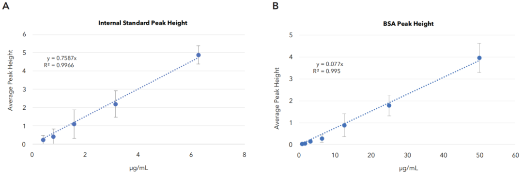 ⬆ 內標檢測動態范圍為100-0.4 μg/mL;BSA檢測動態范圍為200-0.8μg/mL,至少2 logs;