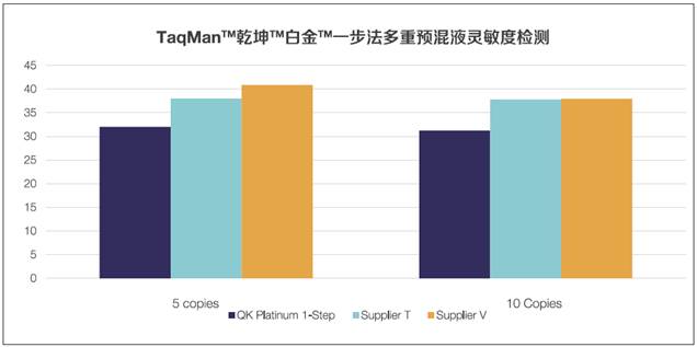 圖1. 乾坤白金一步法多重預混液靈敏度檢測。在20uL反應中檢測到5個拷貝和10個拷貝的人工RNA模板。