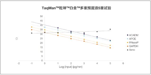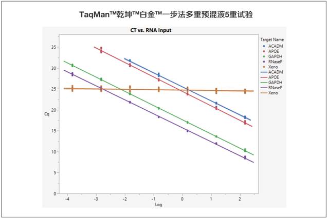 圖3. 乾坤白金一步法多重預混液5重試驗。圖中顯示了使用乾坤白金一步法多重預混液,人類RNA的ACADM、APOE、GAPDH、RNaseP和外源性內部陽性對照(IPC)的5重反應的線性回歸結果。