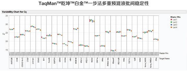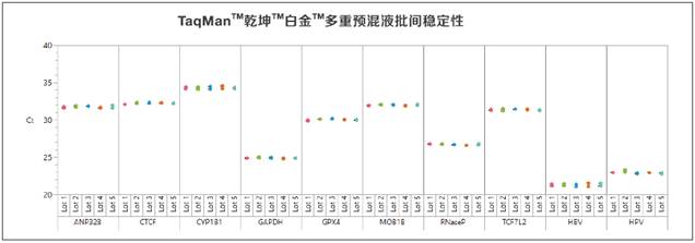 圖6. 乾坤白金多重預混液批間穩定性。顯示了5個不同批次的TaqMan乾坤白金多重預混在不同基因表達靶標和病毒DNA靶標之間的批間一致性。