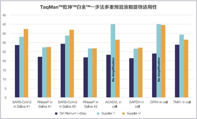 圖7. 乾坤白金一步法多重預混液粗提物適用性。圖中顯示了在處理過的唾液和細胞粗提物中檢測外源性病毒和內源性人類RNA靶點的結果。