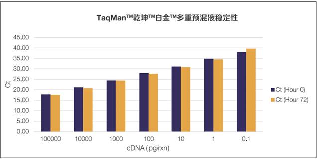 圖8. 乾坤白金多重預混液桌面穩定性。用不同濃度的ACTB靶蛋白、人cDNA和預混液完全建立反應體系,在0小時和室溫72小時分別檢測,TaqMan乾坤白金多重預混液表現出極佳的桌面穩定性。