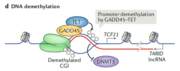 TCF21是與一種抑癌基因,在多種癌癥中表達(dá)下調(diào),它具有頭對頭反義lncRNA TARID(TCF21 antisense RNA inducing demethylation)。TARID轉(zhuǎn)錄過程會在TCF21啟動子附近形成R-loop,被R-loop識別蛋白GADD45a結(jié)合,GADD45a進(jìn)而招募去甲基化酶TET1,促進(jìn)DNA去甲基化來增強(qiáng)TCF21轉(zhuǎn)錄,影響細(xì)胞周期。