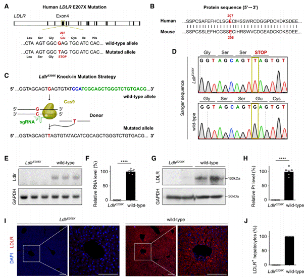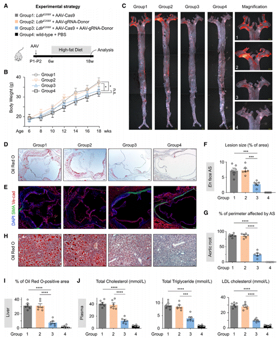 家族性高膽固醇血癥(FH)是一種常見的遺傳性高脂血癥,通常由低密度脂蛋白受體(LDLR)基因突變所致。研究人員通過CRISPR/Cas9構建了點突變小鼠模型,并采用AAV-CRISPR/Cas9基因治療技術,結果證實AAV-CRISPR/Cas9系統對攜帶Ldlr突變的小鼠進行的LDLR基因校正能夠部分地修復LDLR表達,并有效改善LDLR突變體中的動脈粥樣硬化,為FH患者的治療提供潛在的治療方法。