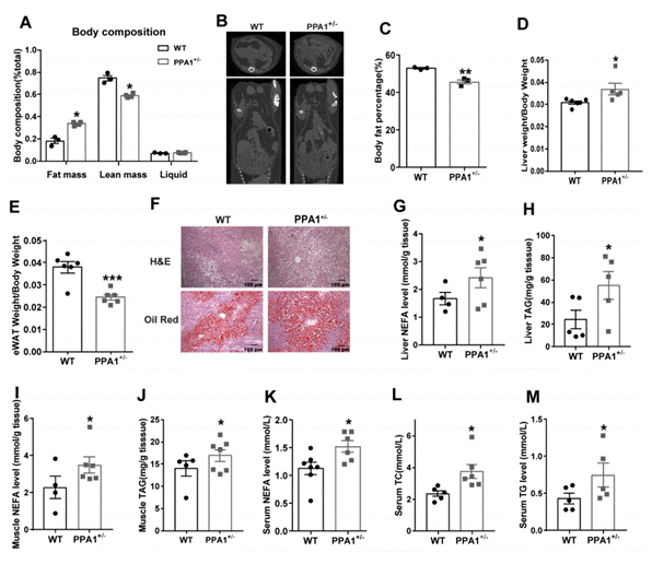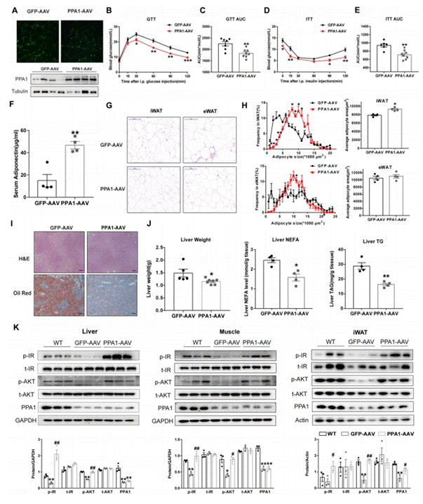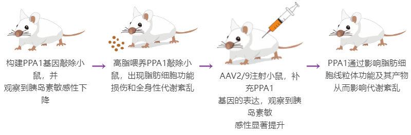 近年來研究表明胰島素抵抗與代謝紊亂相關,為探討PPA1對全身性胰島素敏感性的影響,研究人員首先構建了PPA1基因敲除小鼠,通過高脂喂養后出現脂肪細胞功能損傷和全身代謝紊亂,并表現出多組織的胰島素抵抗。進而通過AAV遞送系統使PPA1基因敲除小鼠體內過表達PPA1,發現全身性代謝紊亂和胰島素抵抗得到了顯著改善,進一步證實PPA1可作為PPARγ靶基因,起到維持脂肪細胞線粒體功能并達到調節全身胰島素敏感性的作用。