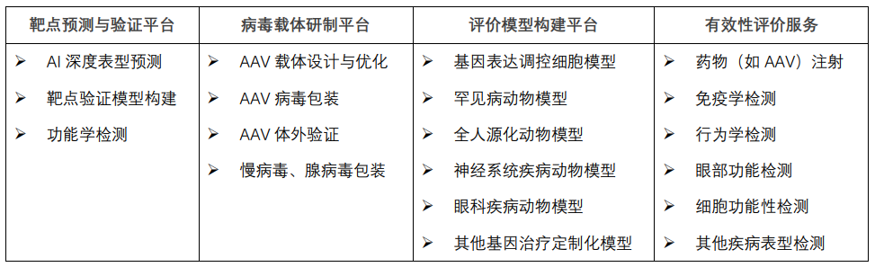 賽業生物作為一家綜合解決方案提供商,建立了多位一體的創新性CRO平臺服務網絡。在過去十余年,賽業生物積累了大量的生物信息及基因編輯方面的數據,病毒包裝、細胞穩轉株與基因編輯模式動物方面項目經驗,可為從事基因治療的研究者提供更高效的基因功能解析與基因治療整體解決方案,包括靶點預測與驗證研究,動物模型構建和病毒載體如AAV、LV、ADV等設計與包裝,以及有效性評價等全流程服務。