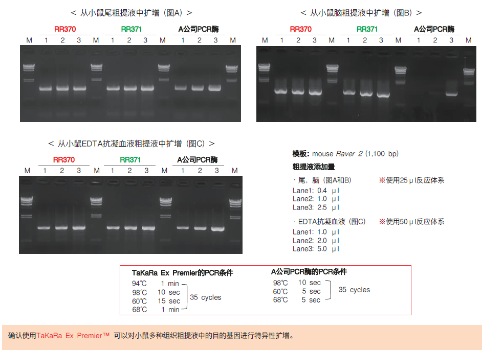 以來自小鼠不同組織(尾,腦, EDTA抗凝血液)的粗提液作為模板,使用TaKaRa Ex Premier(RR370) 、TaKaRa Ex Premier Dye plus (RR371) 和A公司PCR酶進(jìn)行擴(kuò)增。