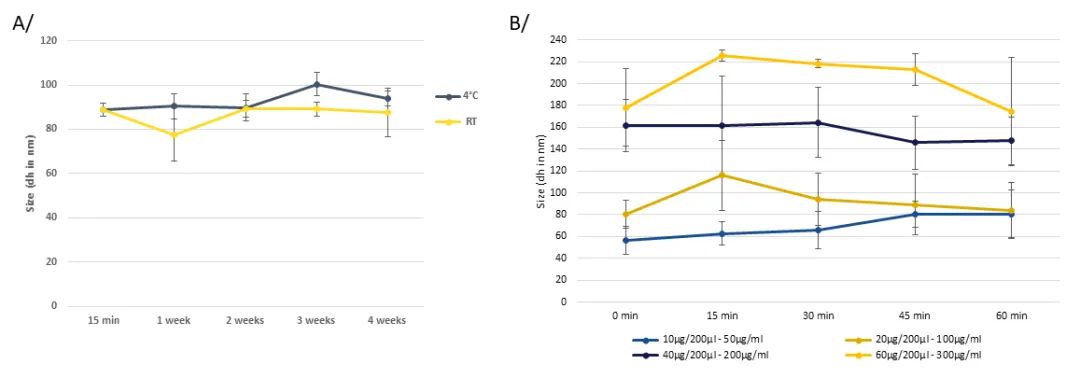 Fig 2. 脂質體 (包含in vivo-jetRNA®+和mRNA) 在低濃度和高濃度mRNA條件下都能保持長時間的穩定。A/ 50 μg/ml mRNA條件下,in vivo-jetRNA®+的脂質體大小,在室溫或4°C儲存15分鐘, 1周,2周,3周和4周后使用動態光散射 (DLS)進行檢測。B/不同mRNA濃度下 ( 50, 100, 200 or 300 μg of mRNA/ml with a small mRNA (1929b)), 用DLS檢測的in vivo-jetRNA®+脂質體的大小。