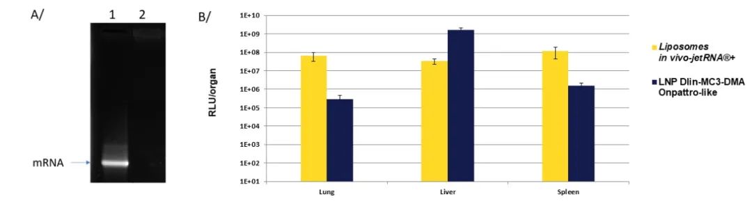 Fig1. in vivo-jetRNA®+可以100%包裝mRNA帶來高效的mRNA遞送。A / 使用凝膠電泳(agarose gel)分析 mRNA alone (lane 1) 和完全被vivo-jetRNA®+包裹的mRNA (lane 2) B/編碼Luciferase的mRNA使用 in vivo-jetRNA®+或Dlin-MC3-DMA LNP 通過iv注射進小鼠。注射后24小時分析Luciferase的表達。