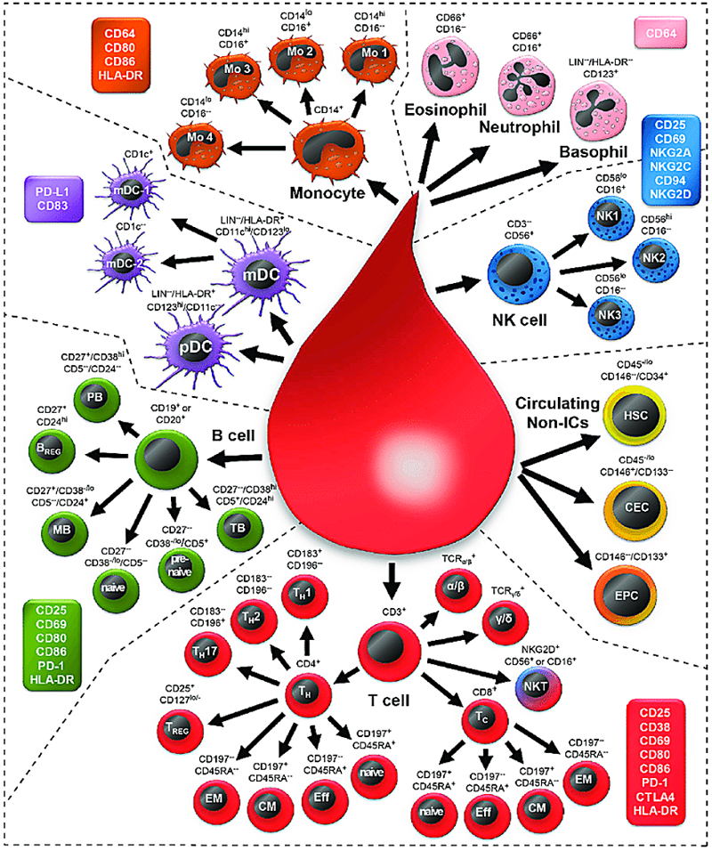 圖中顯示了血液中的免疫細胞和非免疫細胞類型。圖片來源:Rühle等人。https://www.researchgate.net/figure/Schematic-overview-of-the-34-immune-cell-and-3-non-immune-cell-subsets-that-can-be_fig12_306074018